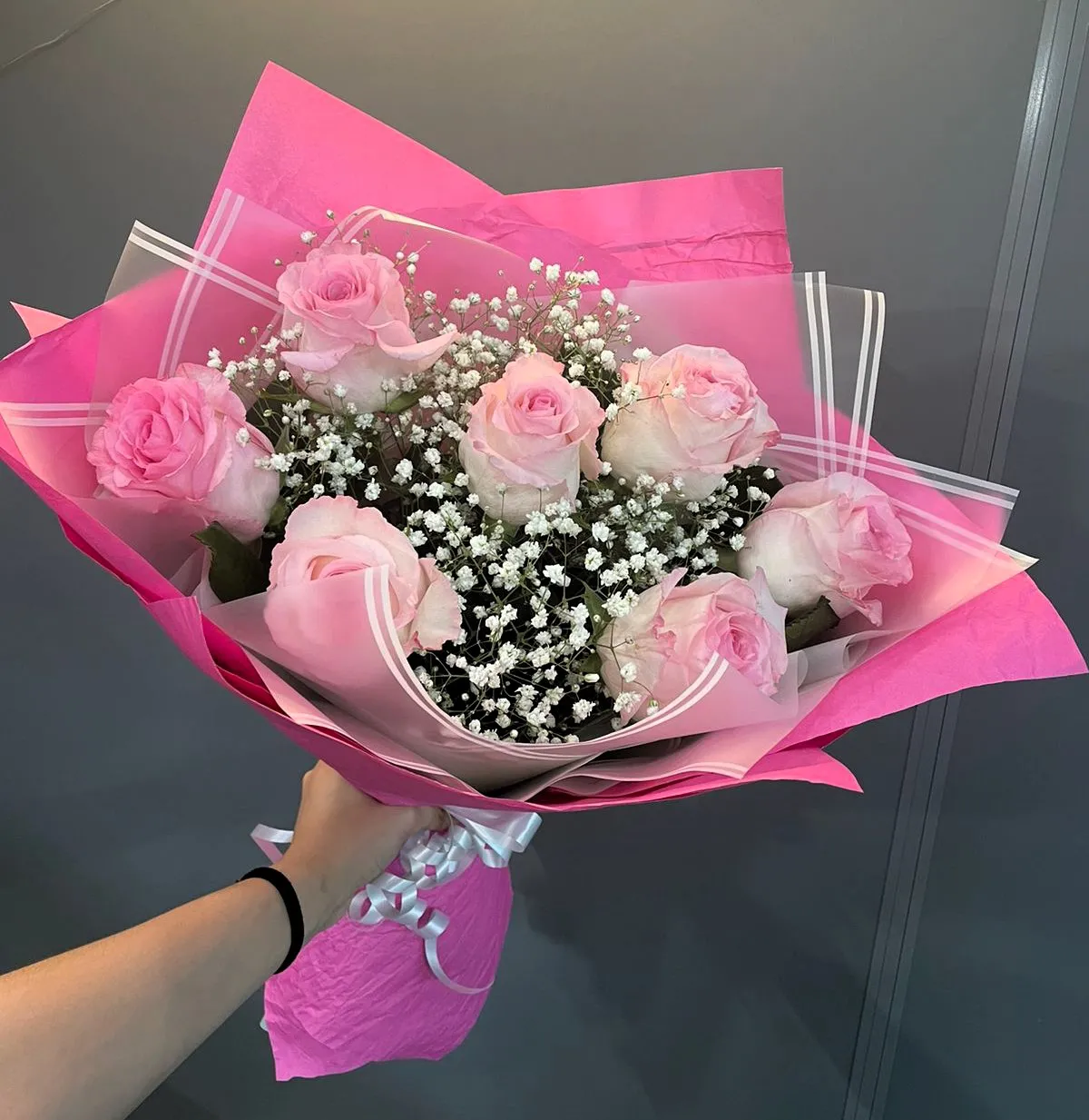 • Средний - роза - 9 шт., гипсофила, упаковка, лента