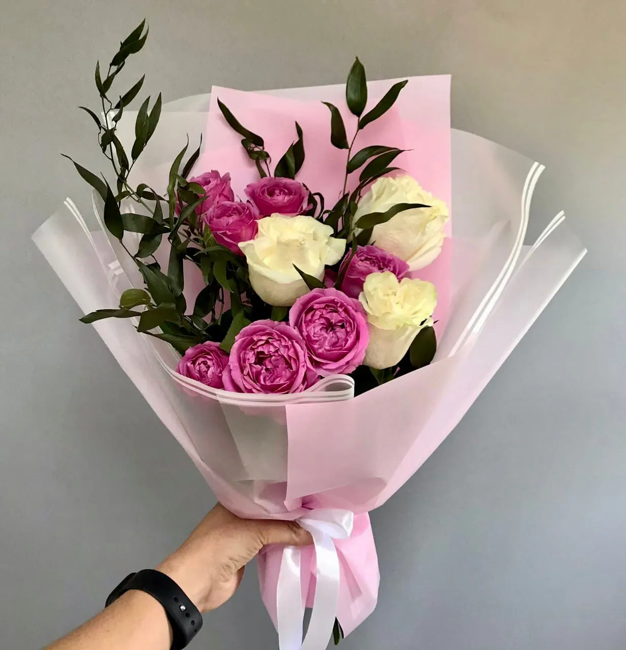 Пионовидная роза, Одноголовая роза, зелень, упаковка лента