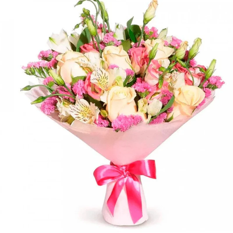 Нежные розы, дополненные снежно-белыми альстромериями – очень изысканная и красивая композиция, яркий пример грации и женственности. Эустома символизирует радость , надежность вместе со счастьем, и весельем. Красивые оттенки нежных розовых и белых цветов смотрятся вместе непередаваемо. Приятные запахи каждого из цветков вместе гармонируют, создавая шикарный аромат, который придется по вкусу всем.