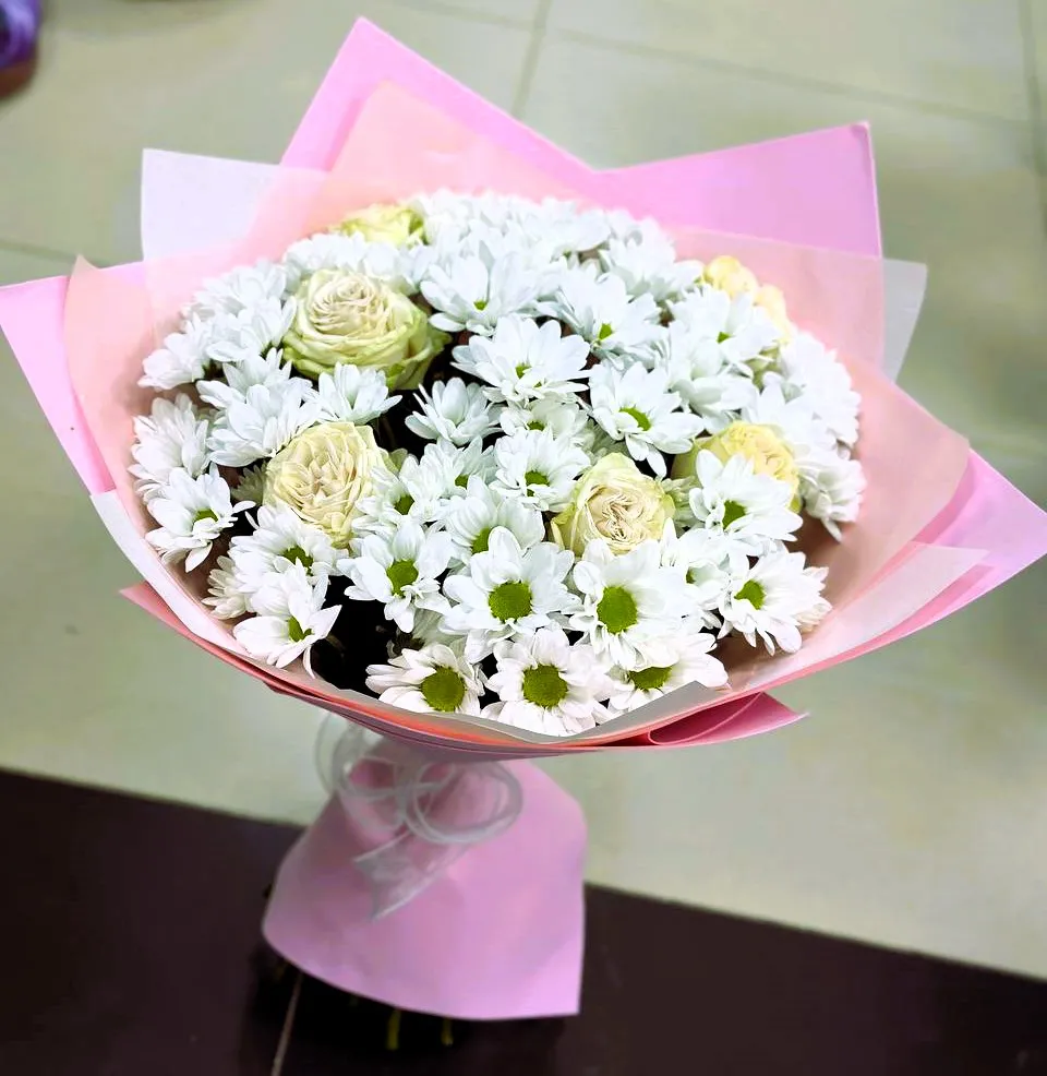 Этот великолепный букет станет идеальным подарком для любого праздника — будь то свадьба, день рождения или просто знак внимания. Комбинация утончённых белых роз и жизнерадостных хризантем подчеркивает глубину эмоций и искренность ваших намерений.
