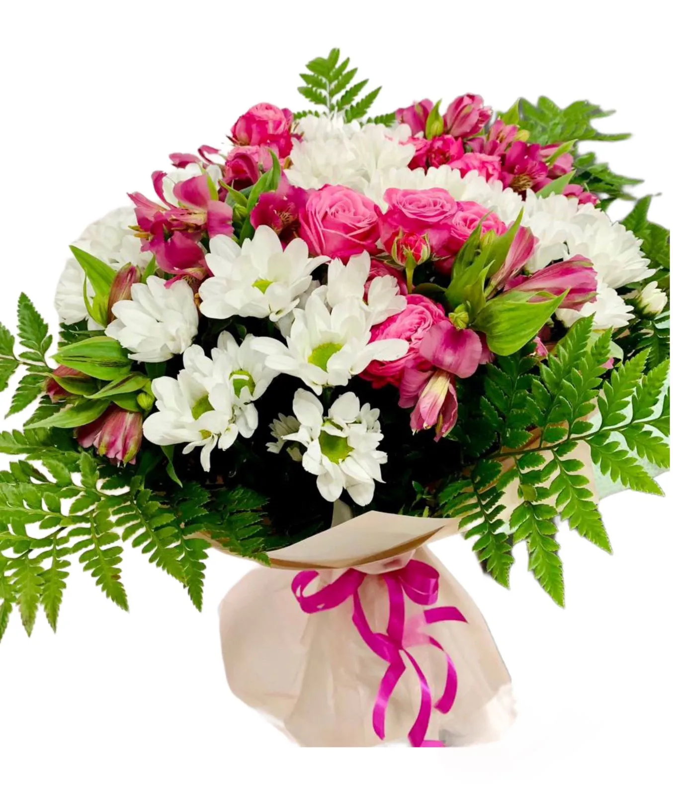 Вариант—Стандарт - кустовая роза - 3 шт., альстромерия - 3 шт., хризантема - 2 шт., зелень, упаковка, лента