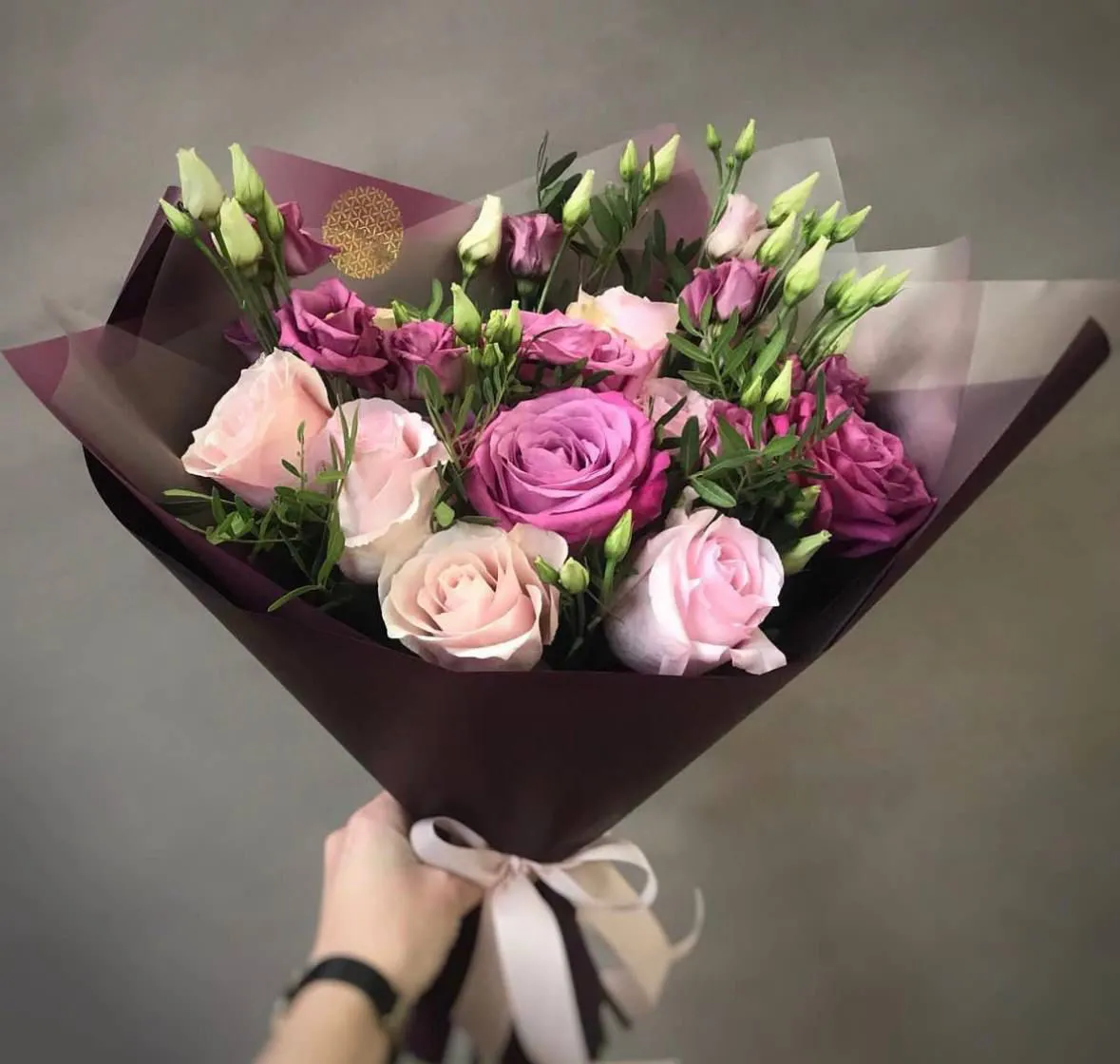 Нежные розовые розы и воздушная эустома создают гармоничное сочетание, которое ласкает взгляд и согревает душу.