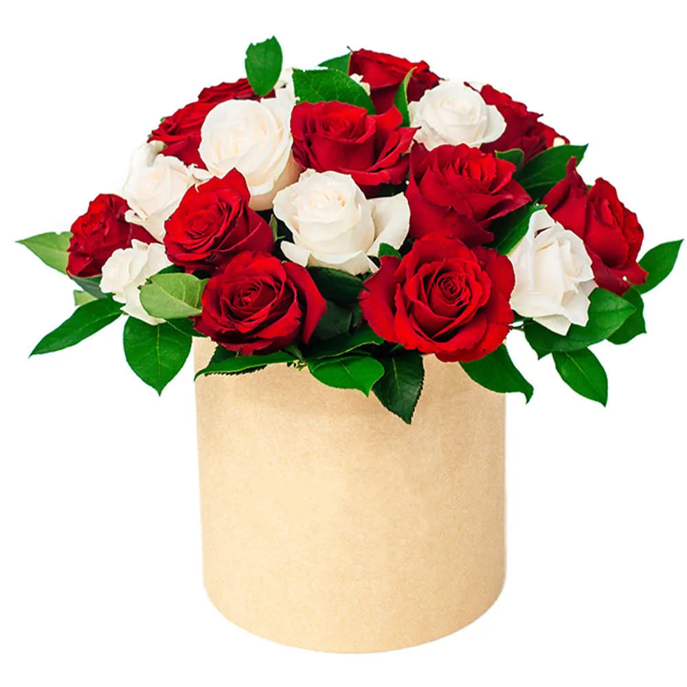 —Букет из красных и белых роз в шляпной коробке