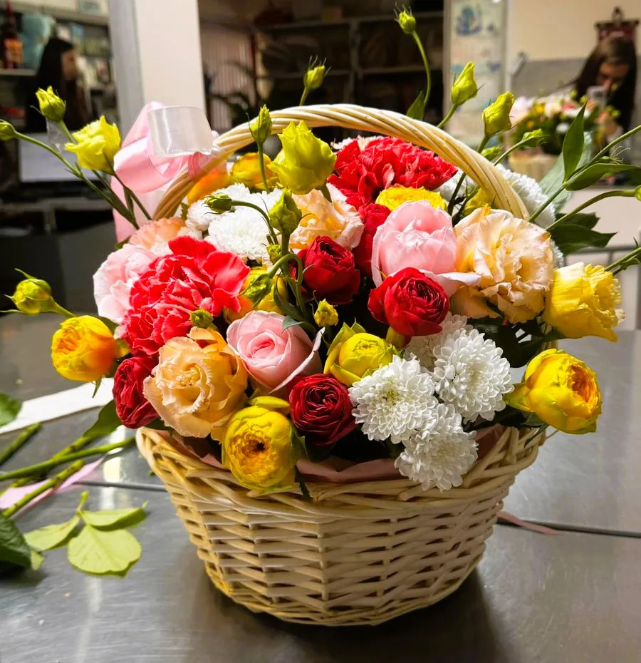 Эта корзина представляет собой яркое и утонченное сочетание природы и искусства. В центре композиции пышно распустились кустовые желтые розы, олицетворяющие солнце и радость, их яркий цвет наполняет пространство теплом. Рядом с ними расположились насыщенные красные розы, символизирующие страсть и любовь, их бархатные лепестки привлекают взгляд и искушают ароматом.