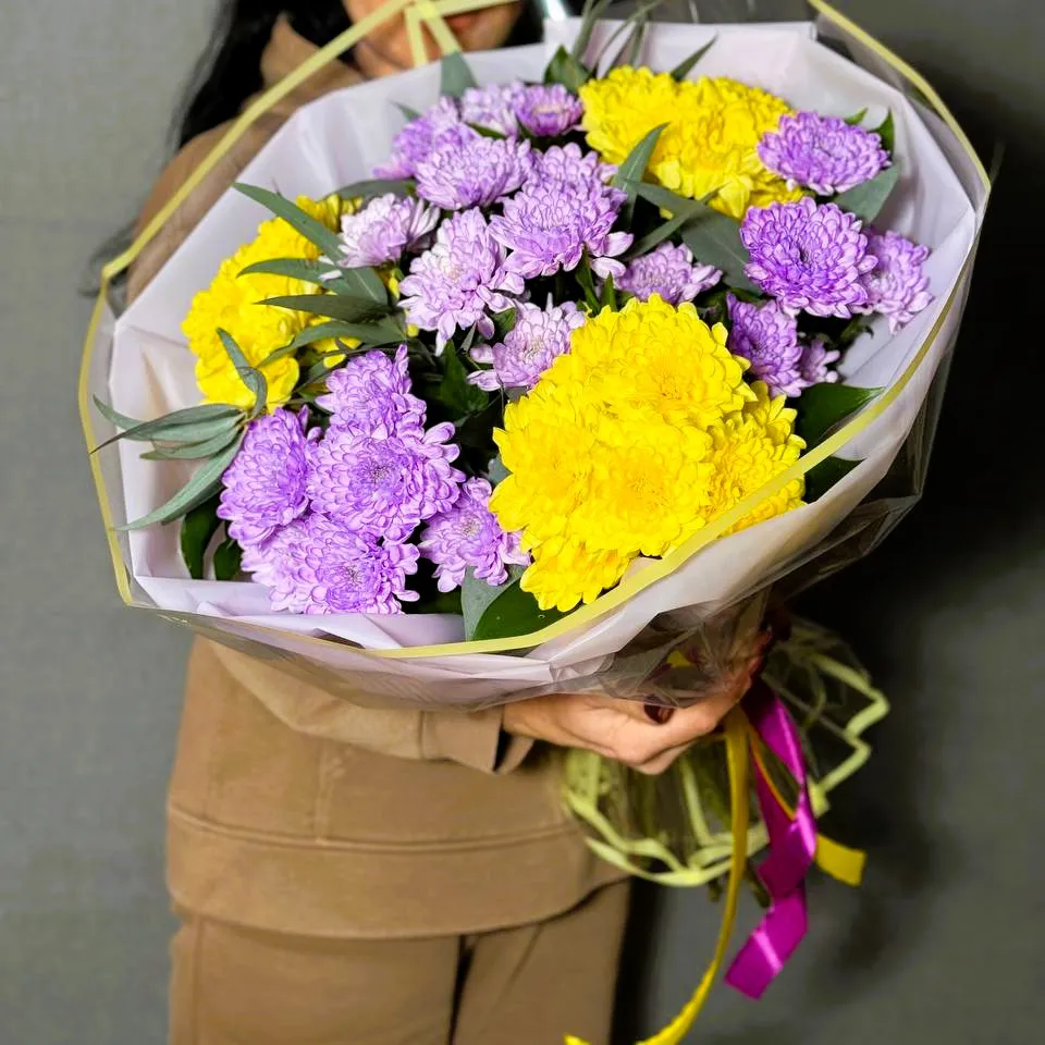 Удивите своих близких уникальным букетом из желтых и фиолетовых хризантем, чтобы передать свои чувства и пожелания в этот прекрасный цветочный язык!