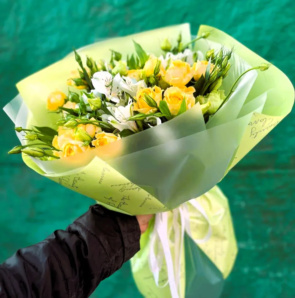 • Премиум - кустовая роза -7 шт., альстромерия - 9 шт.,упаковка,лента