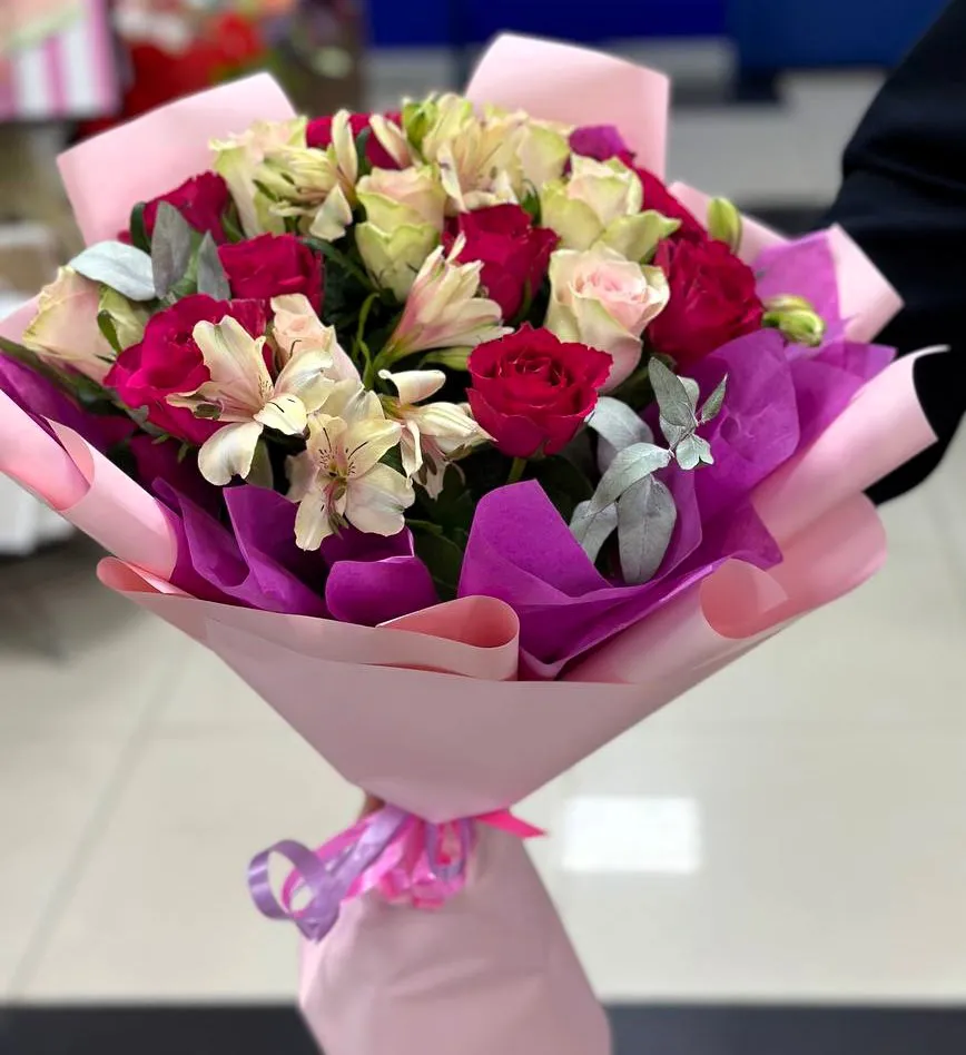 Позвольте себе утонуть в нежной симфонии красок и ароматов, которую дарит этот восхитительный букет. Здесь, словно в волшебном танце, переплетаются величественные розы, символизирующие любовь и страсть, и изящные альстромерии, олицетворяющие дружбу, заботу и благополучие.