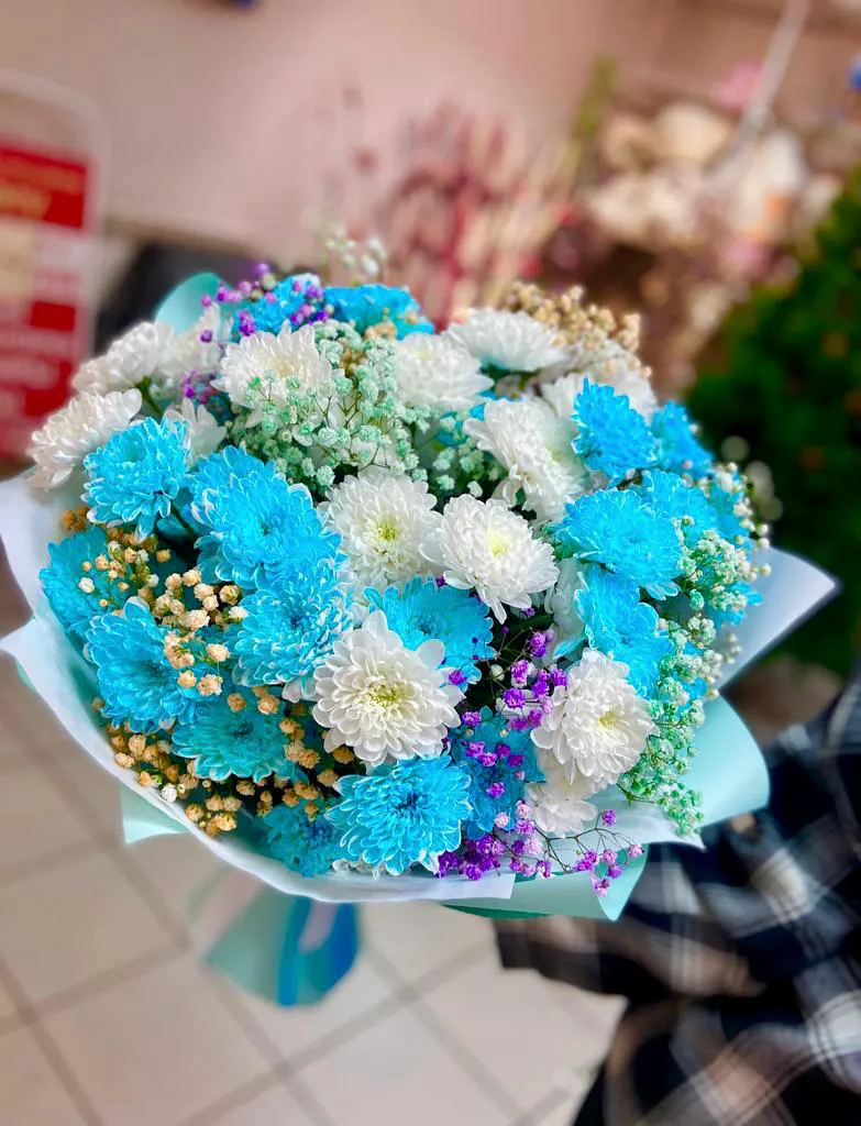 • Делюкс - кустовая хризантема - 15 шт., гипсофила, упаковка, лента