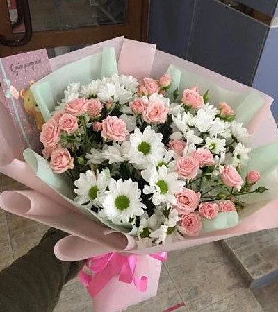 Очень нежный и утонченный букет из кустовых роз и хризантем, придется по душе как девушке, так и ребенку. Привлекательный букет станет чудесным поводом для знакомства и романтических отношений.
